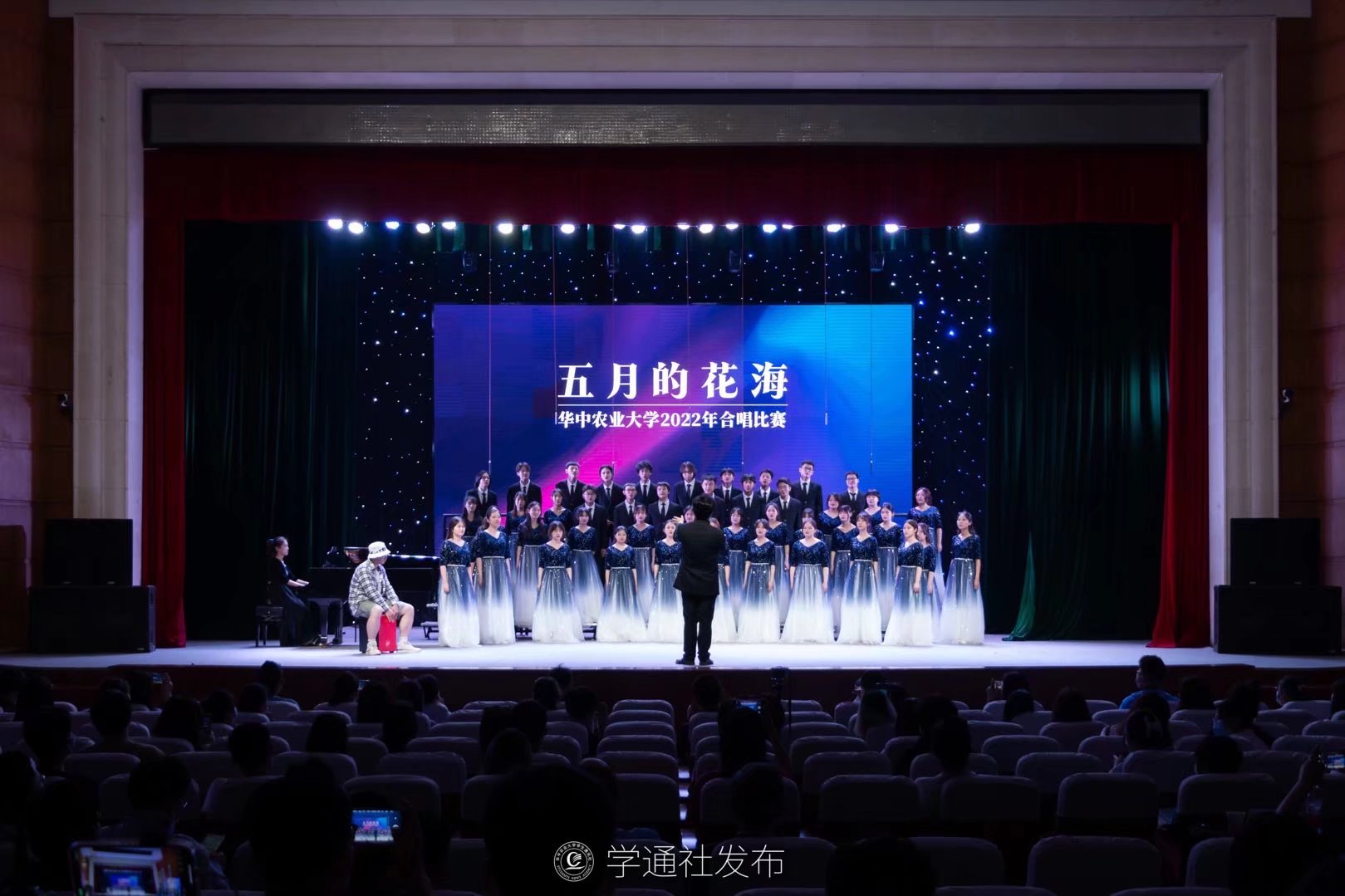 5月22日下午14:30,2022年“五月的花海”合唱比赛在大学生活动中心剧场举行。校党委书记高翅致开幕辞,来自14个学院的合唱团和我校大学生艺术团小宇宙合唱团唱响动人的青春旋律。校党委书记高翅、校长李召虎以及在校的全体校领导、各学院师生代表参加活动。湖北省教育厅艺术教育委员会、华中科技大学艺术学院、华中师范大学音乐学院、中南民族大学音乐舞蹈学院、武汉音乐学院声乐系的老师担任本次比赛评委。