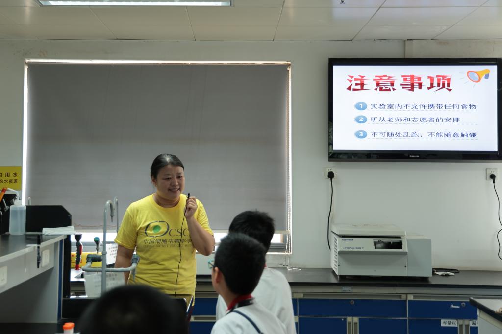 “大家知道什么是细胞吗?”“DNA位于细胞的什么位置?”通过一个个逐渐深入的问题,一个细胞的立体模型在同学们的脑海中构建出来。大家根据老师的讲解及PPT的展示,了解到DNA是位于细胞核中染色体。老师们进一步向大家介绍了染色体的组成并提出了基因的概念,进一步拓展了课程的内容并引入了本次科普日活动的实验内容——植物DNA的提取。