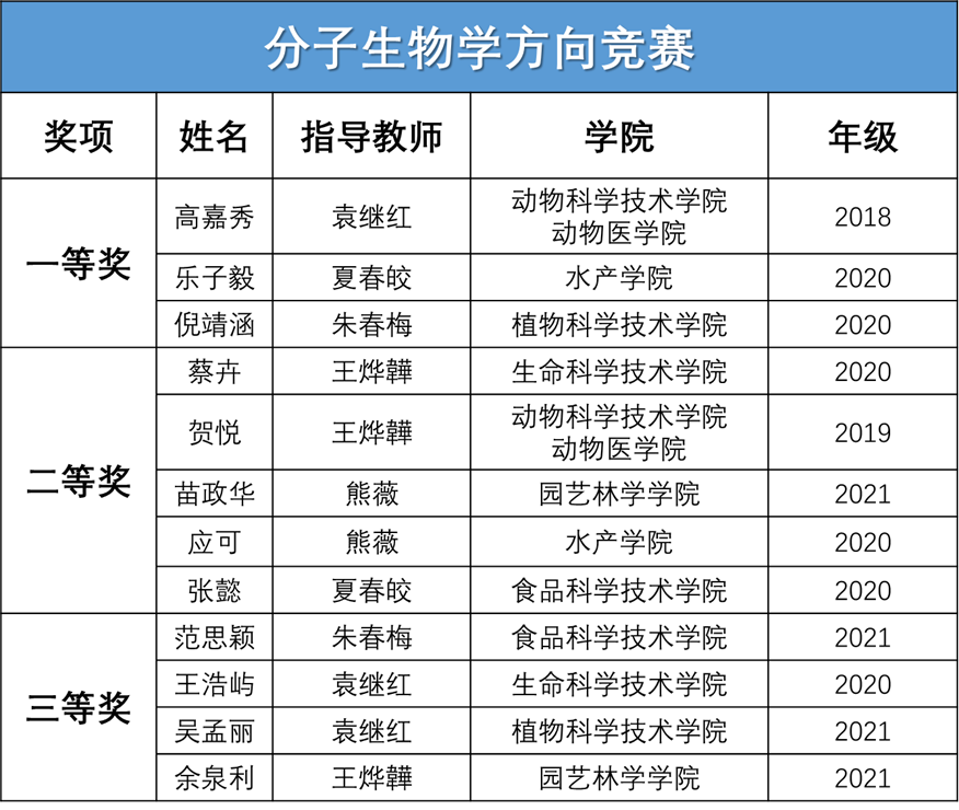 本次竞赛分为初赛与决赛两个部分。初赛内容为线上虚拟仿真实验,决赛为现场实验操作,考察同学们对理论知识的掌握,全面分析问题、设计实验方案的能力,以及规范的实验操作技术。我校新葡萄8883官网AMG、植物科学技术学院、园艺林学学院、动物科学技术学院与动物医学院、水产学院、食品科学技术学院共6个学院24名学生参赛,最终经过专家评委的严谨评审,我校共获得5个一等奖,10个二等奖,8个三等奖。其中生科院2人参加生物化学方向竞赛,分别获得一等奖和二等奖;2人参加分子生物学方向竞赛,分别获得二等奖与三等奖。