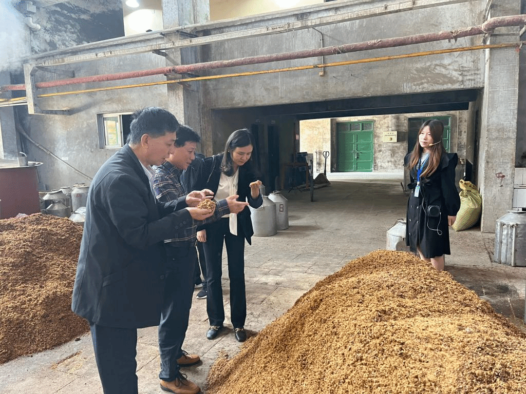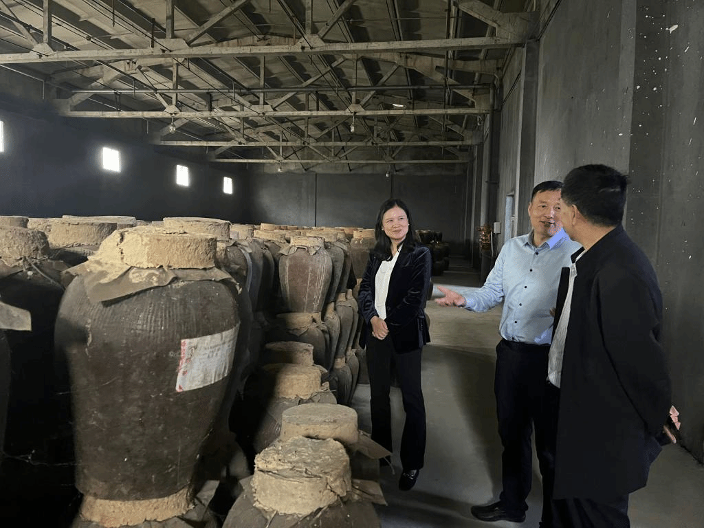 范金凤一行参观了湖北枝江酒业股份有限公司固态发酵生产流程,考察传统固态发酵、蒸馏、储存、勾兑的生产工艺,湖北枝江酒业副总经理刘前生、公司总工程师张明陪同。