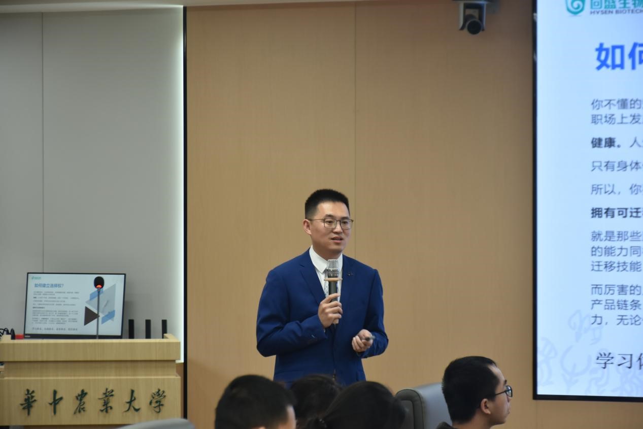 韩杰详细介绍了自己从初入职场磨炼到入职武汉回盛生物科技股份有限公司的历程,从“格局与规范”、“跳出舒适区”两个方面向同学们分享自己的职场经验。“博士毕业我考取了公务员,公务员的工作经历给了我很大的帮助。政府工作的锻炼让我拥有了规范严谨的文字表达能力,这在任何行业都是必需的。”“要做事,要先学会做人,做人首先要有格局。”韩杰结合自己的亲身经历谈到,工作中需要学会站在全局思考工作的方方面面。他还通过推荐《框架思维》一书建议同学们要建立自己的思维框架以应对不断变化的复杂世界。