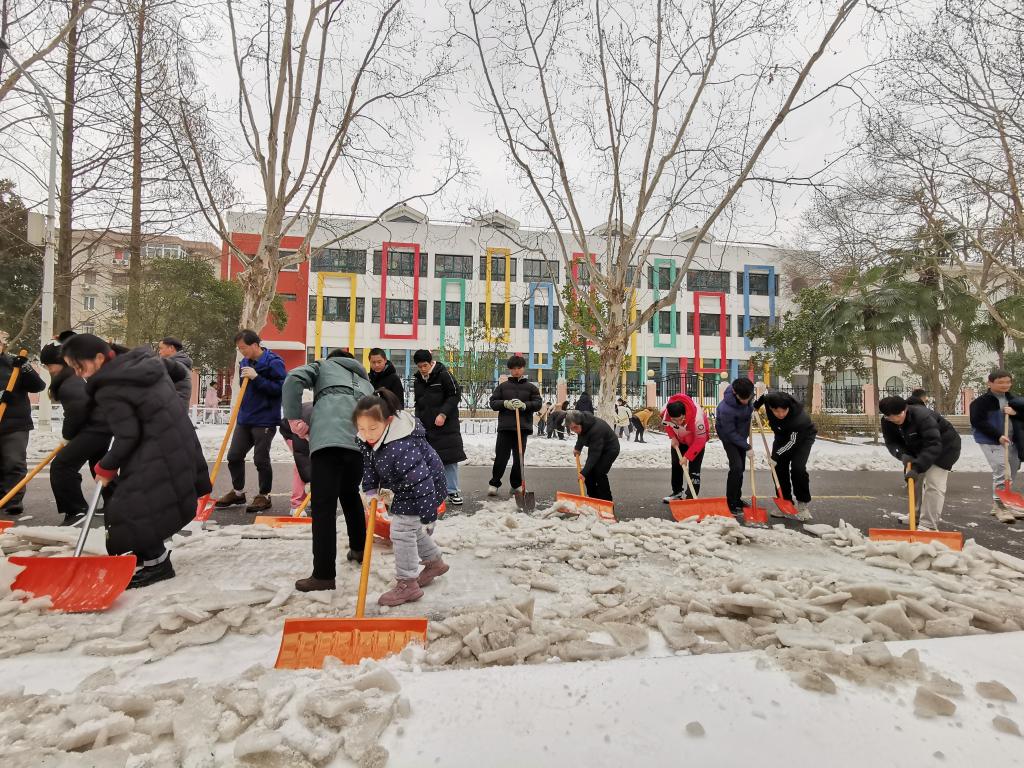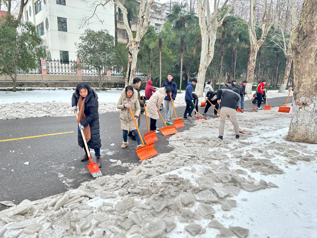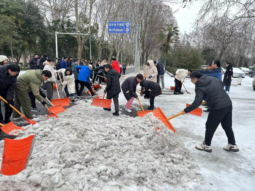 师生们纷纷拿起铲雪工具,用力凿开冰块铲起积雪,每一次挥动都显得坚定而有力。尽管天气寒冷,师生们热情高涨不退,齐心协力破冰除霰,他们的脸上洋溢着满足的笑容。