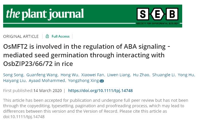 2020年3月14日,The Plant Journal 在线发表了作物遗传改良国家重点实验室/新葡萄8883官网AMG邢永忠教授为通讯作者题为“OsMFT2 is involved in the regulation of ABA signaling-mediated seed germination through interacting with OsbZIP23/66/72 in rice”的研究论文。