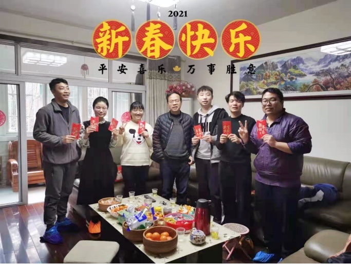 18级微生物学硕士耿阳说:“春节临近,面对严峻复杂的新冠疫情,BMB实验室老师和部分学生积极响应国家号召,就地过年。尽管没有回家,但春节该有的习俗我们一样不少。大家一起写春联,贴福字,增添喜庆的氛围。一起购办年货,布置房间,大年三十我们在会议室一起吃团圆饭。老师们从家中带来美味的菜肴,热气腾腾的火锅里散发出浓浓的年味。欢声笑语中,我们共叙去年的感悟与收获,表达对2021年的美好祝愿和期待。”
