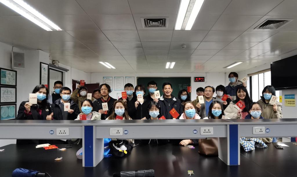 学院班子与生科类1806班同学手持鼓励卡合影留念