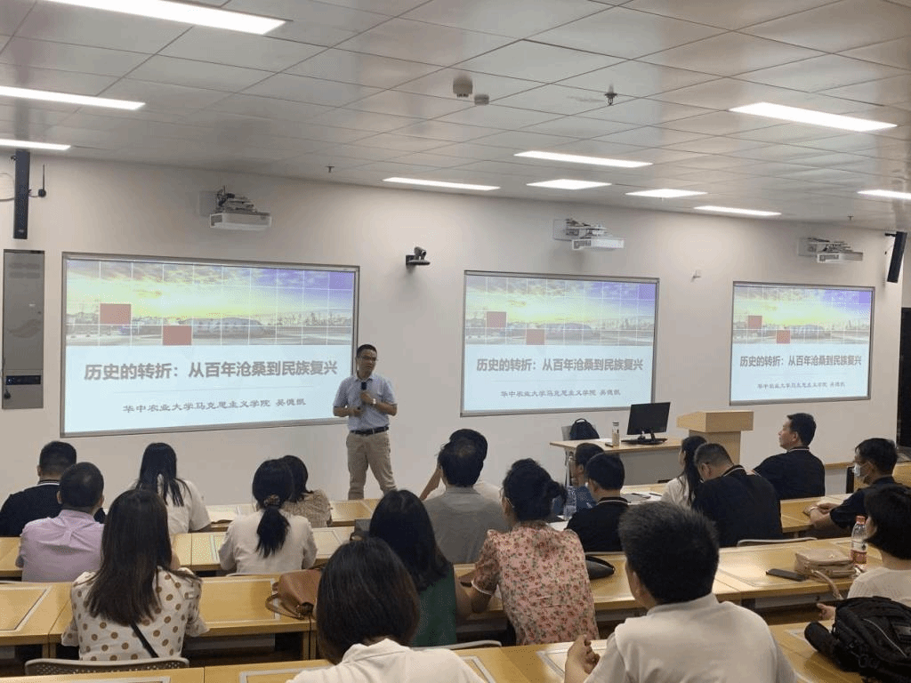 吴德凯首先围绕世界百年未有之大变局和中华民族伟大复兴的战略全局这“两个变局”展开,讲述了从百年沧桑到民族复兴的历史进程。他跨时空对比讲述了东方与西方“最厉害的时候”的历史概况,分别介绍了西方古罗马时期、文艺复兴、新航路开辟、工业革命等重大历史节点,展示了资本主义从兴起到壮大再到确立的过程。他用幽默诙谐的语言阐明了中国近代史上的三次觉醒,以及无数仁人志士为救国救民进行了不懈探索过程,从戊戌变法到辛亥革命,从清末的“君主立宪”到孙中山的中华民国,都没能根本改变中华民族受压迫、受剥削的悲惨境地,“自从有了中国共产党,中国革命的面目就焕然一新了”,生动阐释了“中国共产党的领导地位不是自封的,而是中国历史发展的必然和人民的选择”。