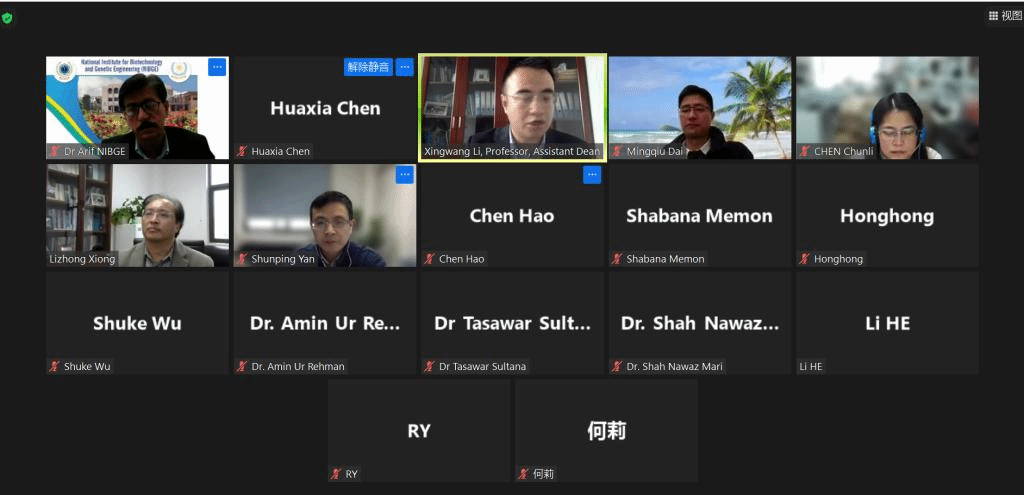 随后,来自巴基斯坦国家生物技术和基因工程研究所的Muhammad Arif教授通过“基因组学辅助育种在巴基斯坦巴马蒂水稻改良中的应用”的报告介绍了巴基斯坦目前水稻产业的基本情况,他提到目前巴基斯坦生产的一半以上水稻可以出口赚取外汇,但随着气候模式(降雨强度和分布、温度波动、大气湿度模式和干旱期)的变化,农作物也面临着新的挑战。巴基斯坦国家生物技术和基因工程研究所随即针对Basmati水稻品种开发了不同的抗病、抗旱、高产品种,目前正在审批当中。来自木尔坦MNS农业大学的Muhammad Ali 博士、SherShoaib Ur Rehman助理教授则分别介绍了高温胁迫下玉米PERK基因家族的全基因组鉴定与表达分析情况及大豆中GmHH3基因家族的特征。拉瓦尔品第干旱农业大学的Amin Ur Rehman博士则介绍了拟南芥中参与ABA反应的2个基因PCS1和ACR2的功能分析。来自同一大学的Tasawar Sultana博士则围绕水稻GLP如何增强FeSOD样活性发挥多效性抗尖孢镰刀菌展开交流。来自信德农业大学的Shah Nawaz Mari教授和Shabana Memon副教授通过PPT简要回顾了植物基因组学技术在作物改良和农业驯化中的应用进程及方法。