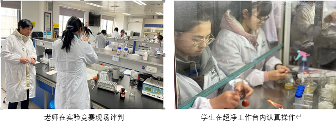 本次竞赛采取自愿报名方式,经过以班级为单位的初选,最终两门课程各选取32位同学参赛。竞赛采取实验操作和卷面考试相结合的形式,学生要完成试卷问答,同时在规定时间内,按要求完成实验操作,并写出书面报告。每一个环节都有详细的评分标准,由老师们当场打分评判,对学生的理论知识,实验设计,动手能力等提出严格要求。