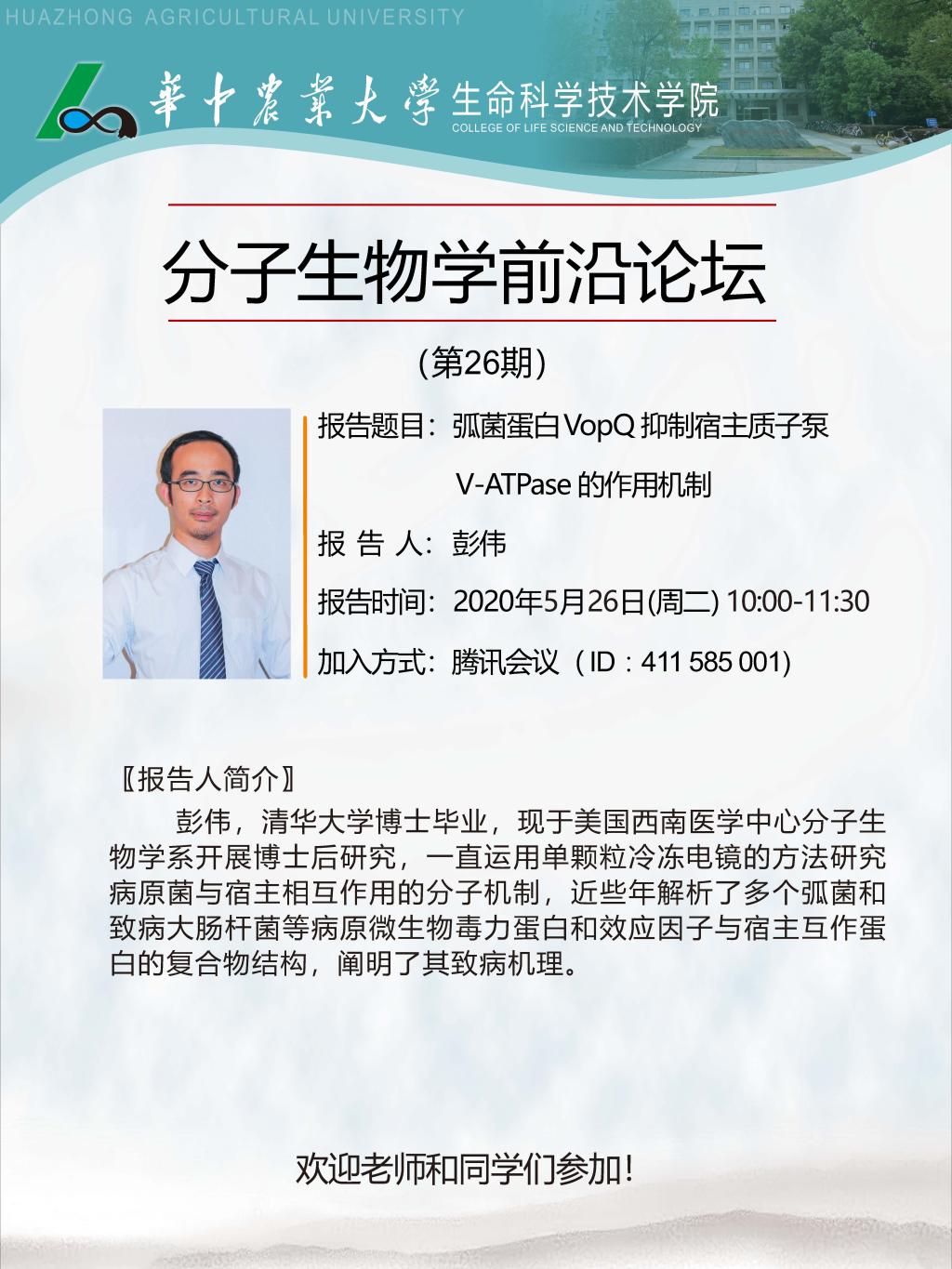 报告时间 2020-05-26 10:00:00 报告题目 弧菌蛋白VopQ抑制宿主质子泵V-ATPase的作用机制