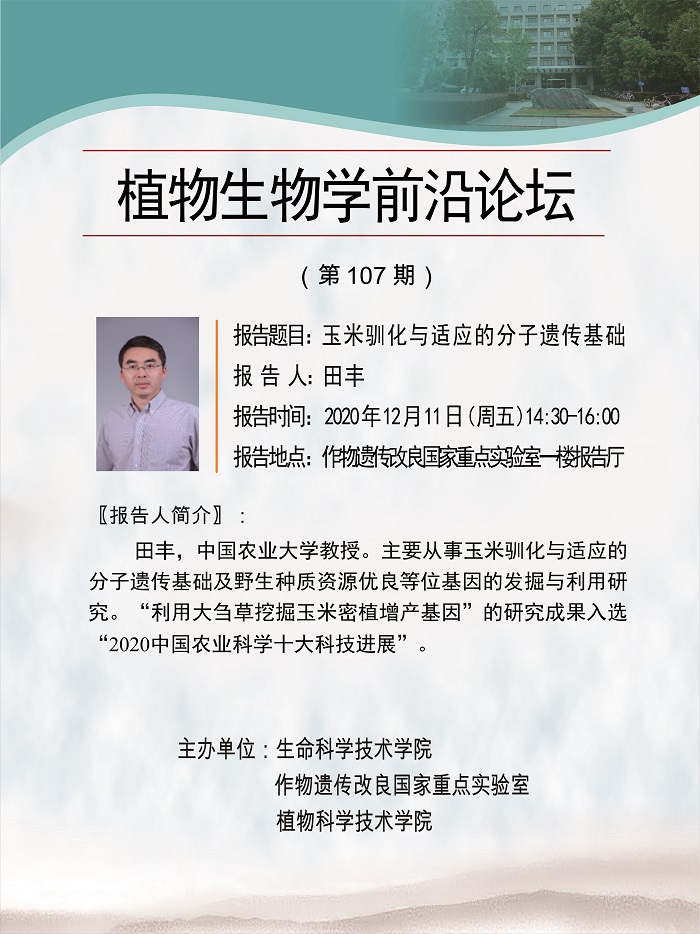 报告时间 2020-12-11 14:30:00 报告题目 玉米驯化与适应的分子遗传基础